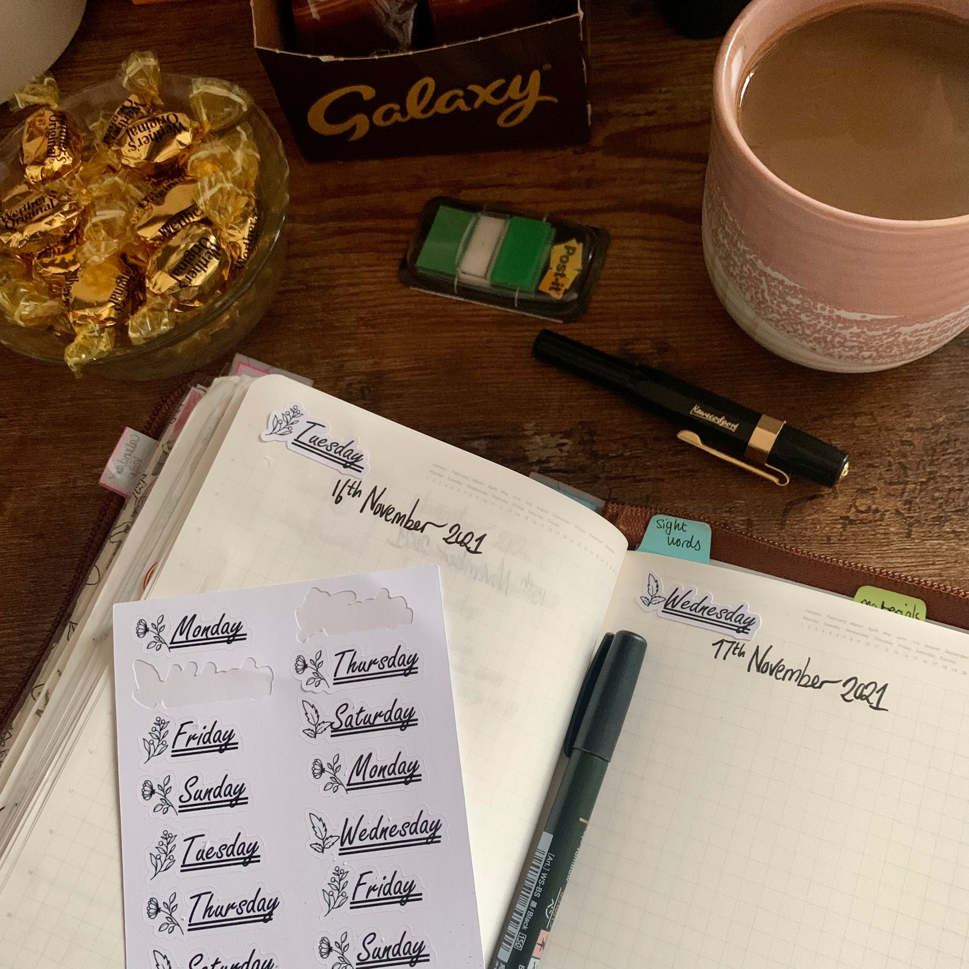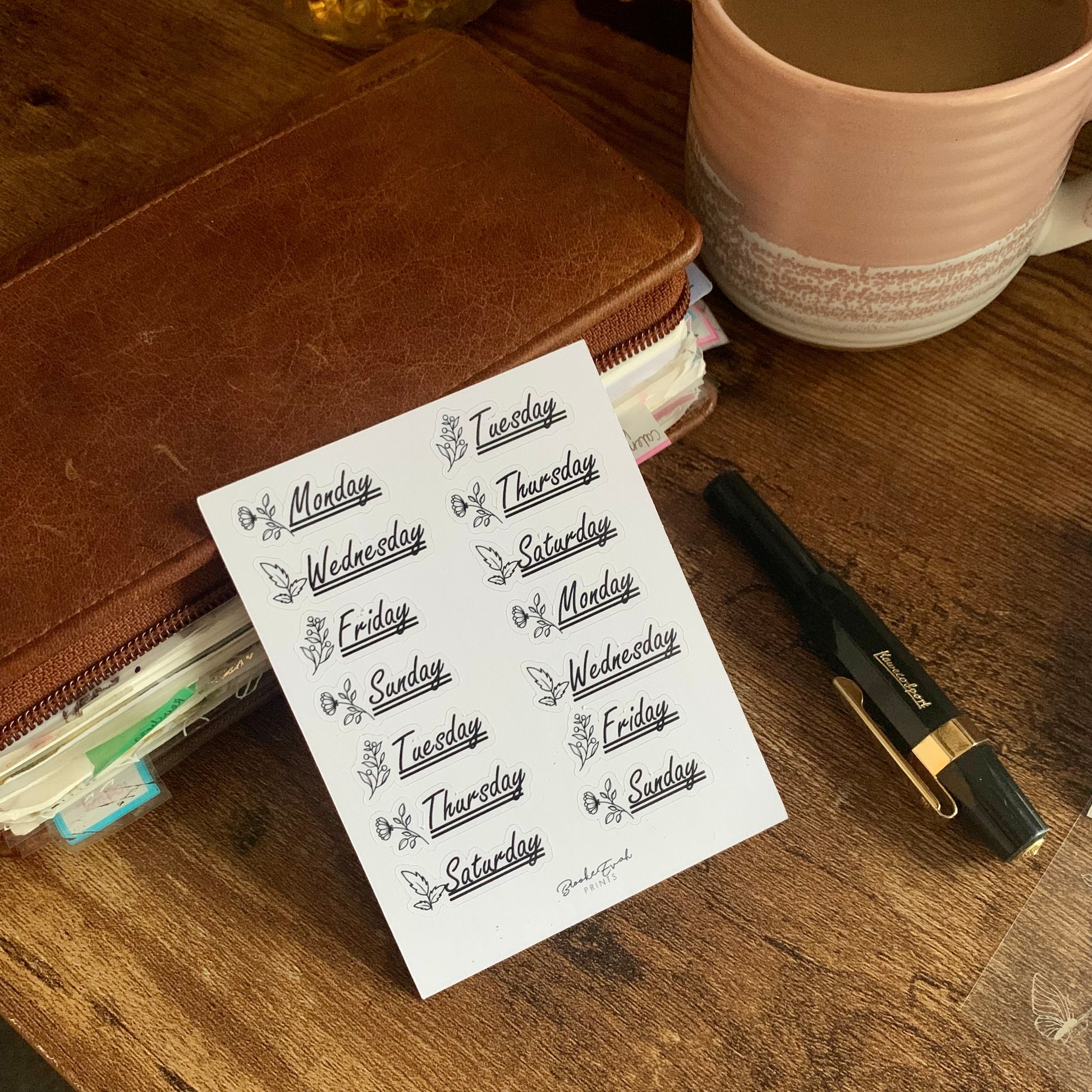 New Hand Drawn Days of the week stickers printed on Premium Matte Sticker Paper. These pretty stikers are repositionable and are great for decorating planners and bullet journals.