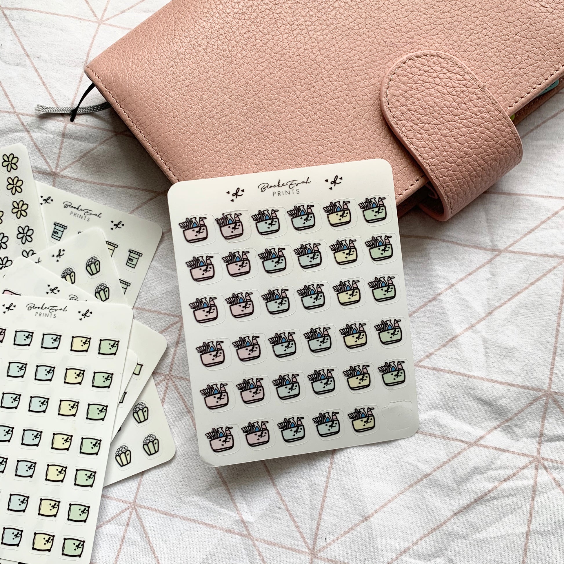 New Cleaning Caddy doodle stickers on our premium glossy clear paper.